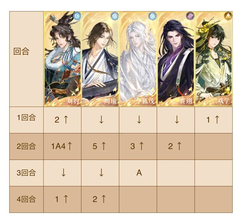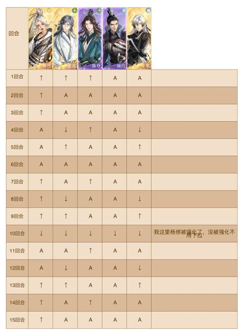 打法:普攻回合杨修摇到几颜良第几个行动,普攻被强化时下拉对应数量密探,技能回合颜良要抗最痛的攻击,比如杨修摇到3,攻击顺序就是34561,即颜良第一个行动,ee第2个行动打死第二个小兵获得数字6,拿不到6的话就都防御