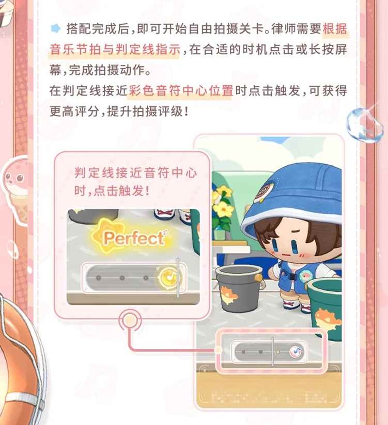 搭配完成后,即可开始自由拍摄关卡。律师需要根据音乐节拍与判定线指示,在合适的时机点击或长按屏幕,完成拍摄动作。在判定线接近彩色音符中心位置时点击触发,可获得更高评分,提升拍摄评级!