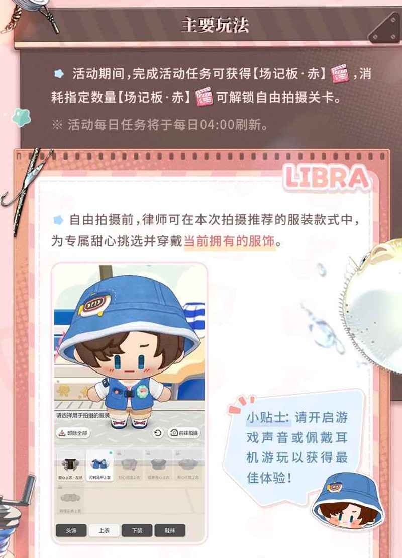 活动期间,完成活动任务可获得【场记板·赤】,消耗指定数量【场记板·赤】可解锁自由拍摄关卡。