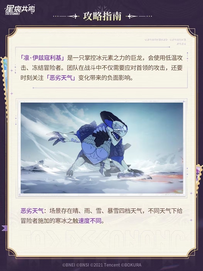 冰霜重击:首领对前方区域造成一次致死伤害,如果没有冒险者在区域内,则造成大范围伤害。该技能需要一名冒险者处于技能范围内,可由守护职业开启减伤技能承接伤害,治疗职业辅助减伤与治疗。