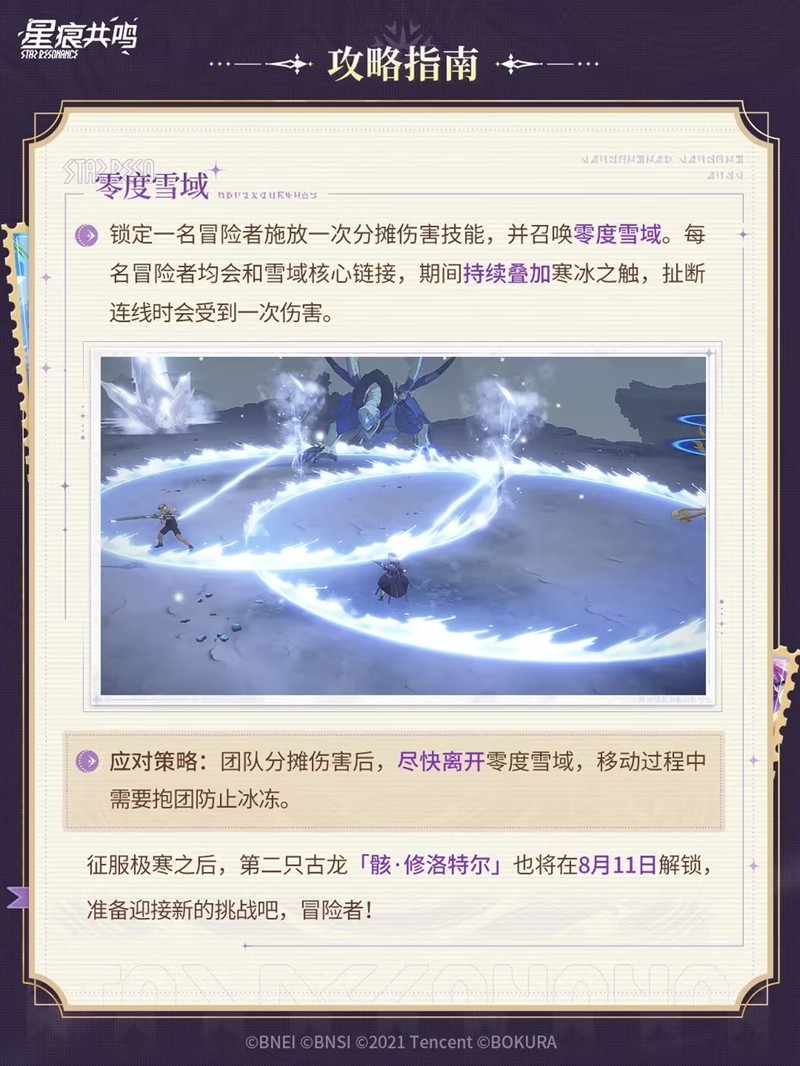 零度雪域:锁定一名冒险者施放一次分摊伤害技能,并召唤零度雪域。每名冒险者均会和雪域核心链接,期间持续叠加寒冰之触,扯断连线时会受到一次伤害。团队分摊伤害后,尽快离开零度雪域,移动过程中需要抱团防止冰冻。