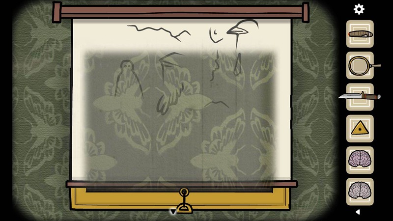 拉下帘子能看到一些特殊图形,这些图形需要与投影画面中的物品重叠。比如右侧的不规则图形可以和男人领带部分重合,这样就成功解开了这个谜题。