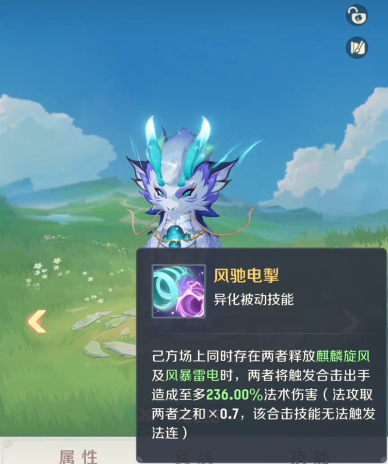 羁绊技能天雷共鸣需要与特定灵兽组队触发,可以提升风麒麟20%技能效果,并附加3秒感电状态。这个技能大大增强了风麒麟的输出能力。