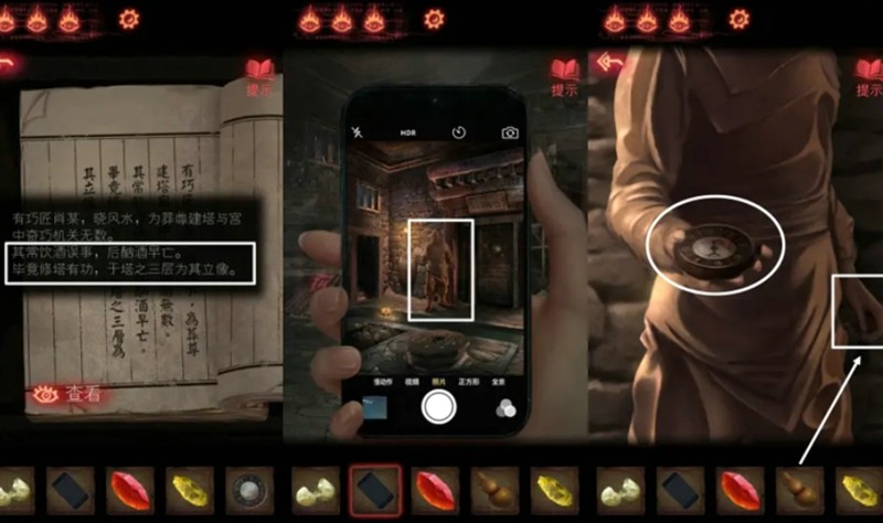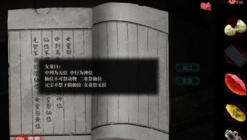 在第五章开始阶段,玩家需要仔细搜索棺材铺场景。架子上可以找到冥币和蓝色模型书两样关键道具。风水书和京剧脸谱册上隐藏着重要线索,需要认真观察其中的规律。左侧机关墙上的字谜需要玩家通过拼凑偏旁来破解,比如”木木示”组合起来就是”禁”字。