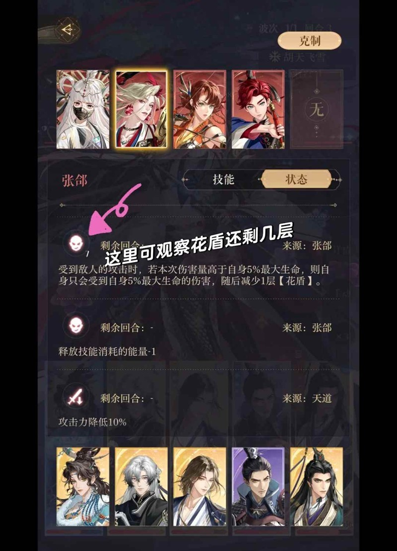 2.对面所有人都有10层花盾。记住观察以下数字香香32045。孙权22640。张郃36451。郭解20027。这是一层花盾的上限血量,当打掉10层花盾后,就可以击杀对面了。记不住打掉几层了可以点右边详情看对面状态有。