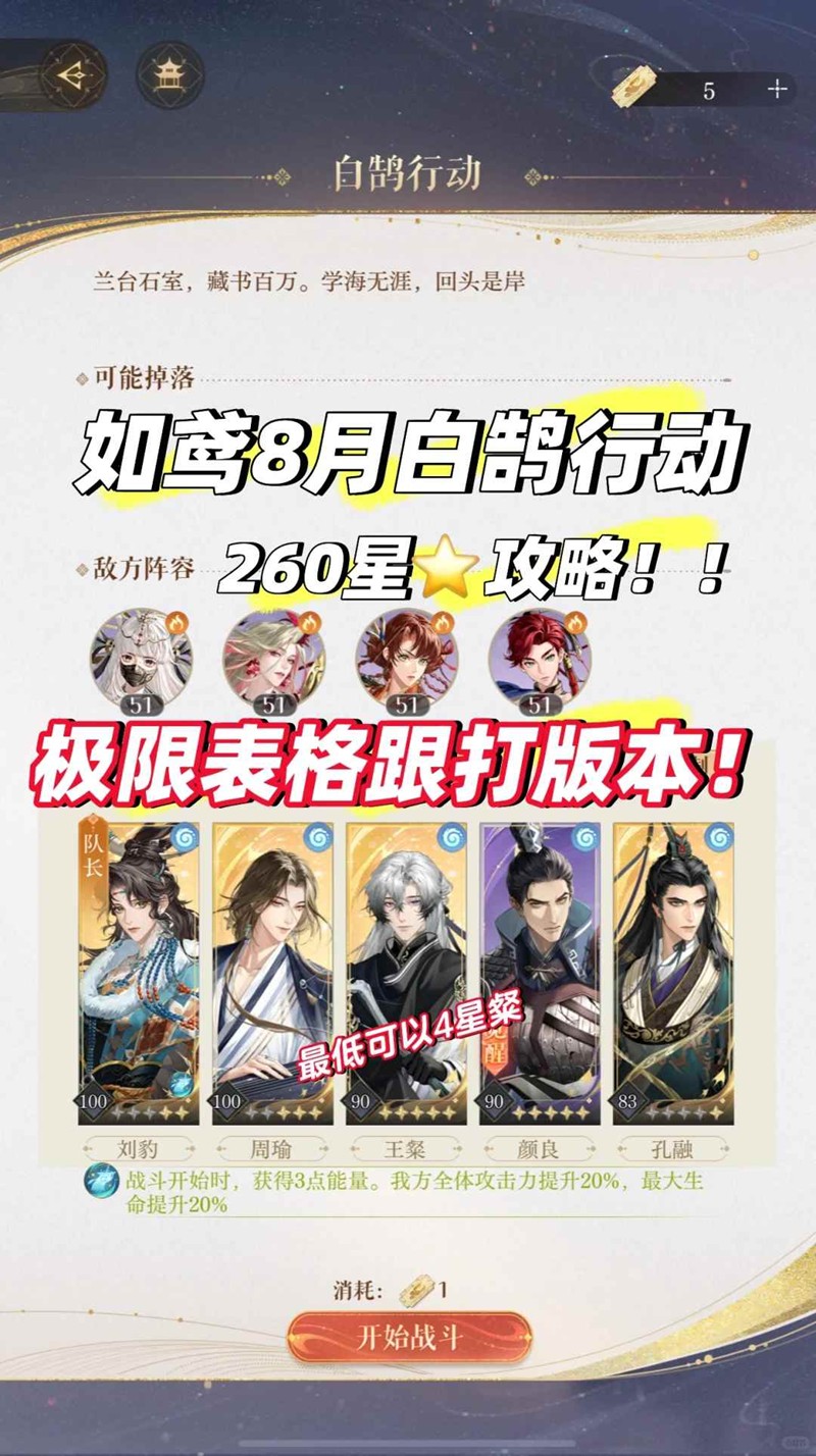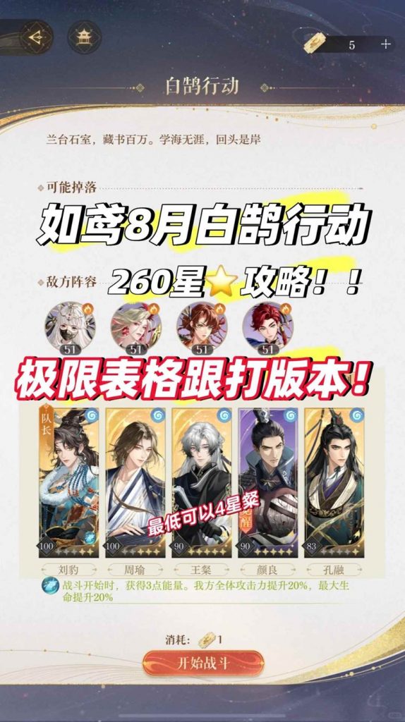 以上就是如鸢8月白鹄行动怎么打满260星攻略的全部内容了,更多游戏资讯,攻略内容敬请关注,您的支持是我们努力的动力!