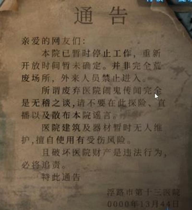 用这把钥匙打开大门,进入13号院的新场景。在前台处拿走笔,查看公告栏和左侧报纸,这些细节信息对后续解谜很重要。