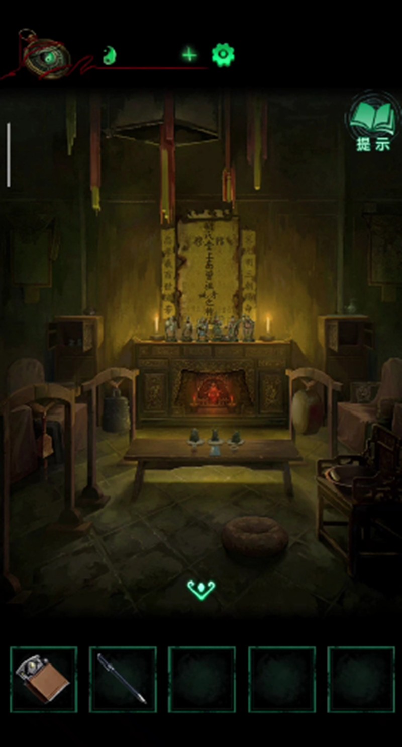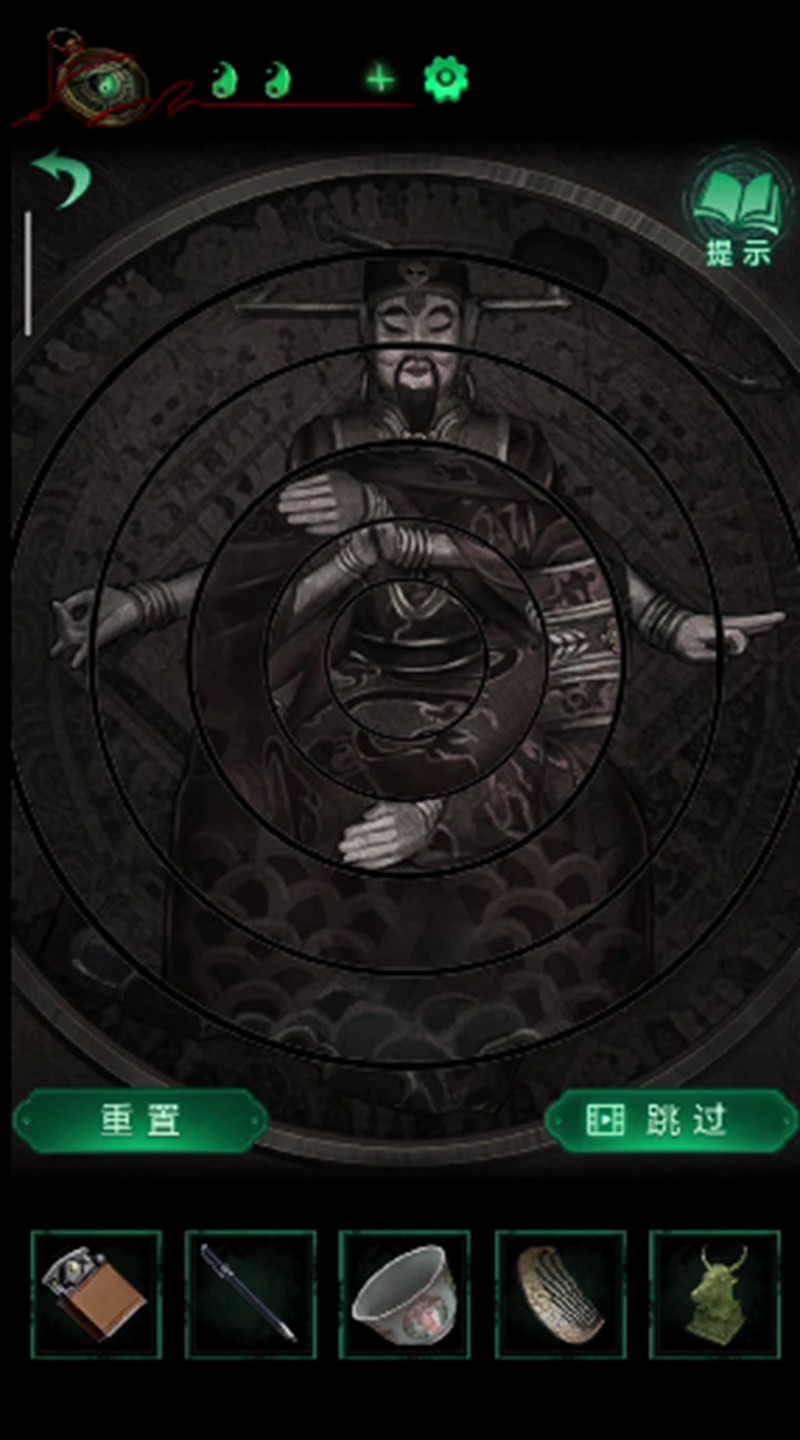 记住转盘文字后,男主角视角打开大门,左右两侧文字分别是”乾咒坤”和”神凡鬼”。七仙女画的颜色要对应改变神兽石头色彩,获得”玉印”道具。最后用印泥给牌匾印上”鬼”字,给纸人穿上嫁衣后点燃。