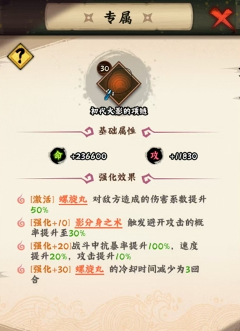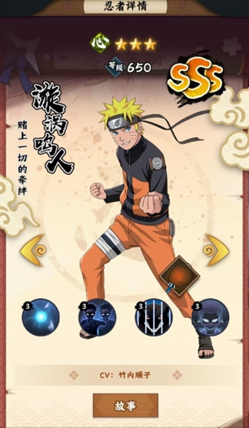 每次行动结束后有30%概率减少必杀技1回合冷却时间。这个被动让鸣人可以更频繁地使用强力技能,在持久战中占据优势。当鸣人达到SSS+品质时,还能解锁专属装备初代火影的项链。