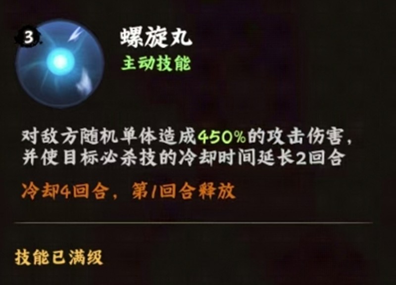 鸣人的标志性主动技能,将查克拉高度压缩形成高速旋转的能量球。这个技能可以对单个敌人造成450%攻击力的伤害,同时还能延长目标必杀技1回合冷却时间。螺旋丸可以在空中释放,特别适合对付地面移动缓慢的敌人,冷却时间为4回合。
