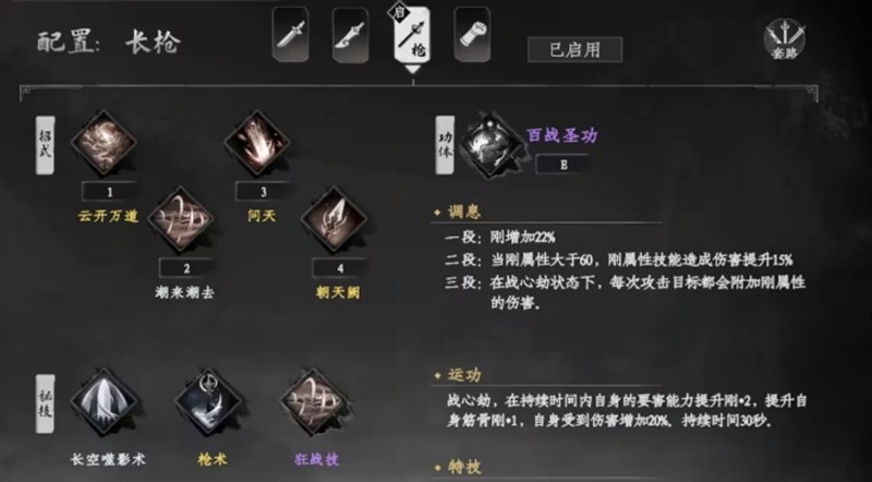 刀枪系武学中,阴系枪法是目前比较可行的选择。功体选用回枪连城,招式搭配百花纵横、银蛇刺空、龙啸碧空和乾坤一掷,护体技能为踏秋水、狂战以及必中护体技能。这套组合可以确保100%实现无限连,其他组合容易出现破绽。阴刀虽然也有一定强度,但由于招式CD较长、出招收招慢等问题,在新版本中难以实现稳定的无限连。
