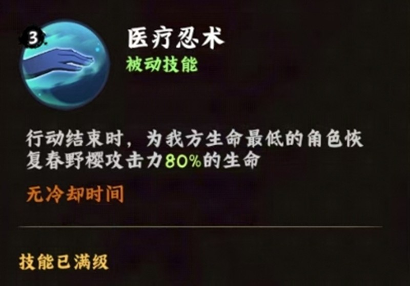 行动结束后,春野樱会自动为我方生命值最低的角色恢复80%攻击力的生命值。这个被动没有冷却时间限制,能持续为队友提供治疗支援。配合另一个被动查克拉控制,还能额外提升20%治疗效果。