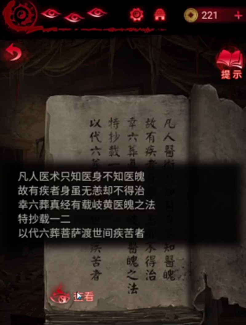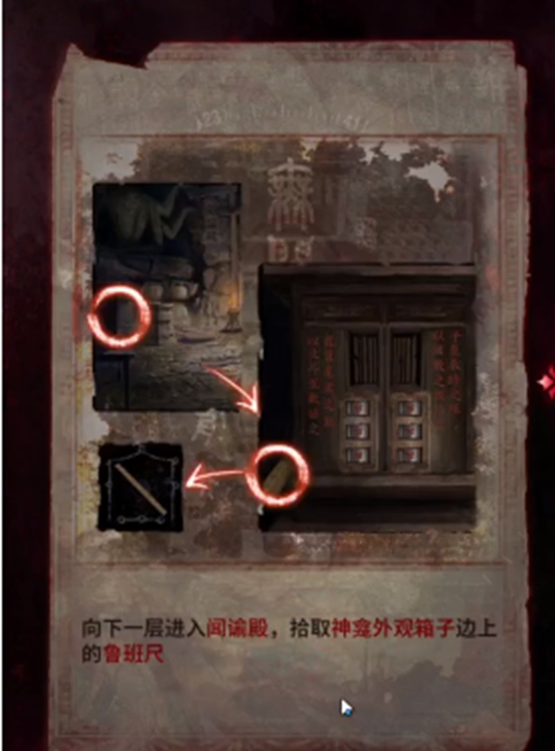 进入下一层后可以获得重要道具鲁班尺。通过观察浮雕墙上的线索,在点燃特定蜡烛后可以触发唐朝幻象。完成拼图小游戏后,玩家将获得竹罐道具。返回火炉处使用小锤子捣碎炼丹材料,等待一段时间后可以获得仙药。将药物放入木偶中可以推进剧情发展,同时获得竹罐道具。使用鲁班尺测量木偶距离可以获得新的线索。