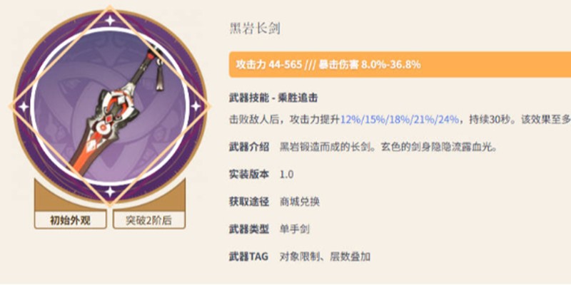 黑岩长剑在90级时的基础攻击力为565点,这个数值在四星单手剑中属于较高水平。同时它还提供了36.80%的暴击伤害加成,对于依赖暴击的输出角色来说是个不错的属性加成。这两个核心属性让它成为不少输出型角色的备选武器。