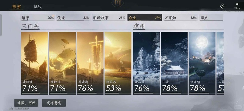 做完这些就点开你的武林录地区调整到河西,点众生这里面能看到你河西地区所有的探索度。接下来我顺便一个地方举例子哪些事情一定要做,哪些事情可以选做,哪些事情可以最后用来补探索度。