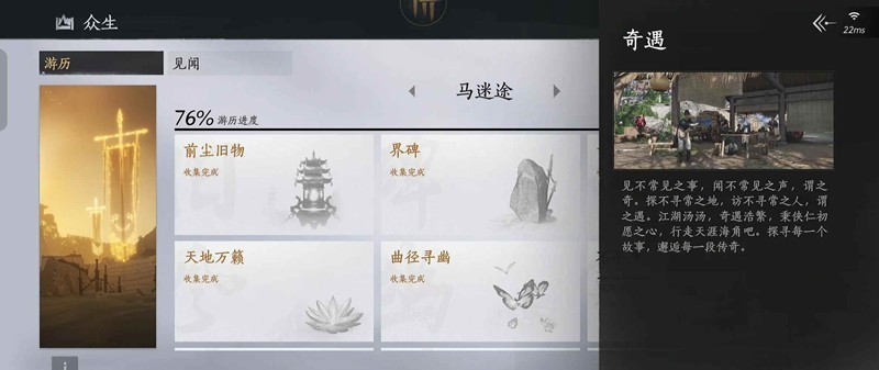 其次就是遇到就要做到天地完籁和曲径通幽,这两个也是容易而且给的很多,建议跑奇遇或者其他什么东西遇到就做了。后期要补的话直接在武林录里面看那个地区没有做到时候直接去搜那个地区天地万籁的位置就好了