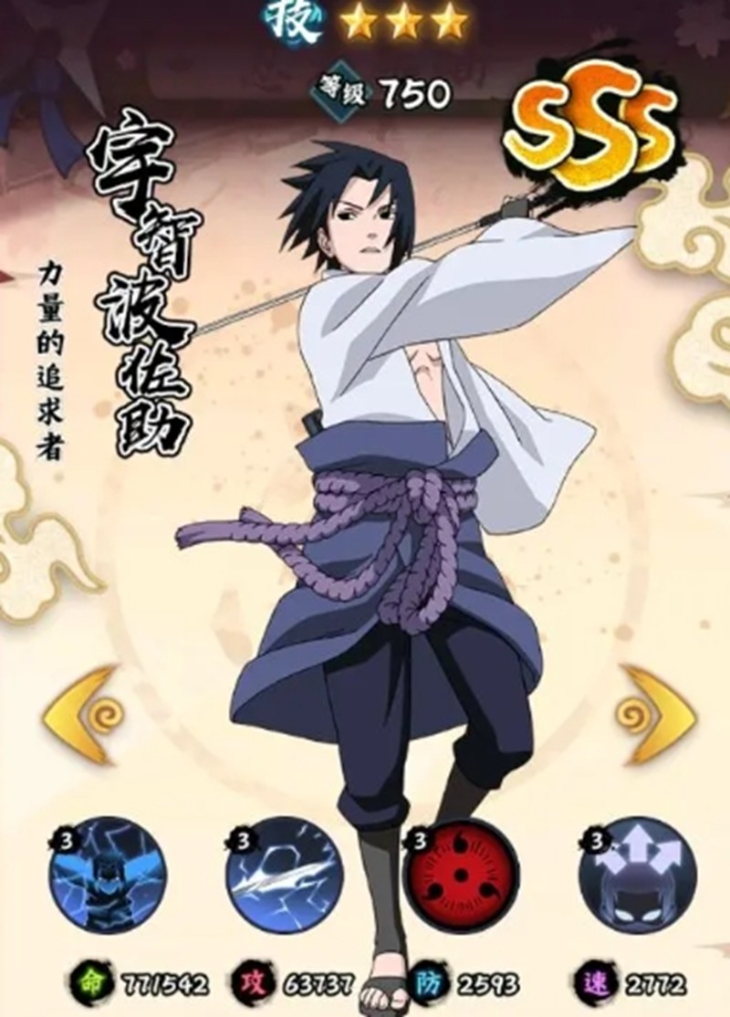 宇智波佐助是当前版本最强势的SSS级忍者之一,他拥有极高的爆发伤害和先手优势。战斗开始时就能给敌人附加易伤状态,并且对易伤目标有额外伤害加成。佐助的速度属性越高攻击力就越强,配合开场提升攻击、速度和暴击率的效果,让他成为团队的核心输出。