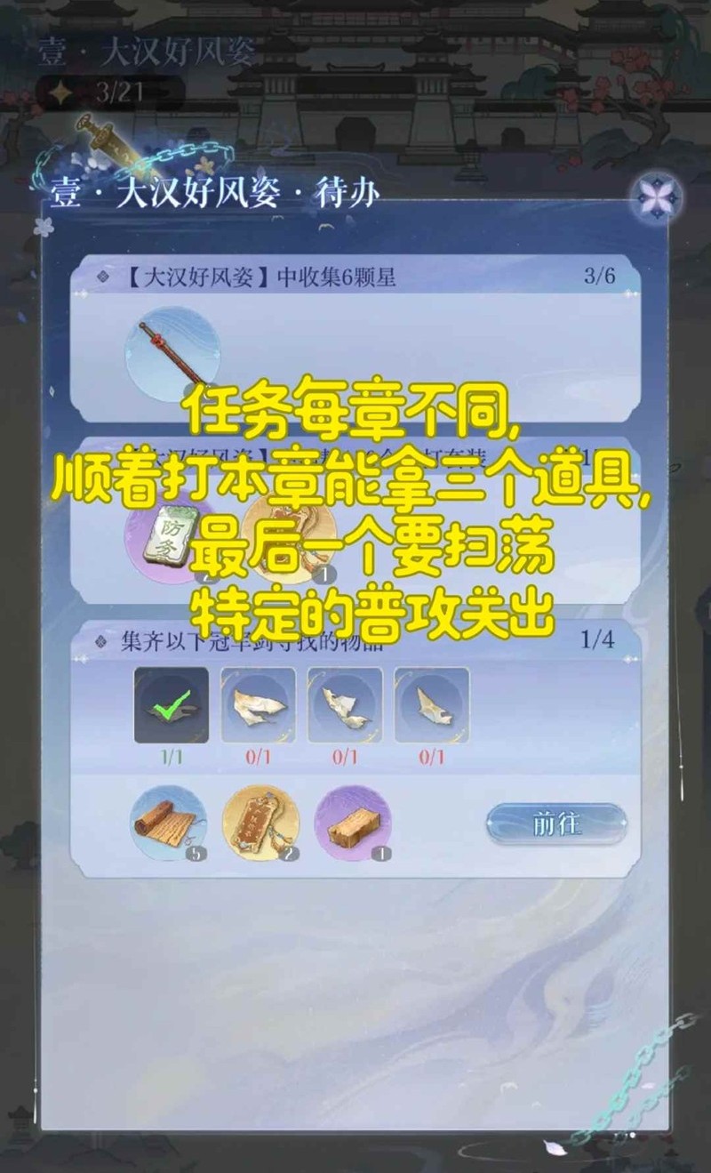 任务,每章不同,顺着打本章能拿三个道具,最后一个要扫荡特定的普攻关能出。
