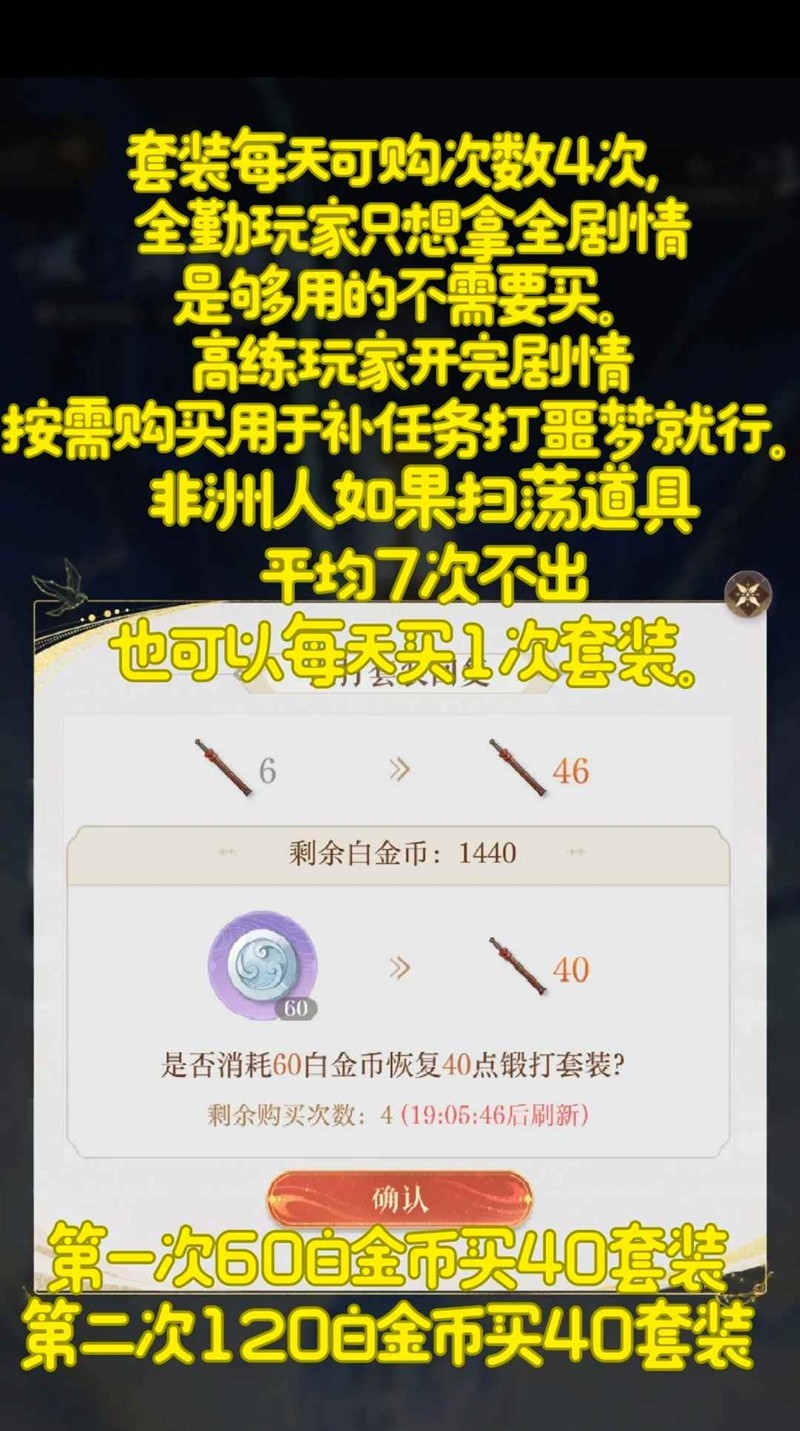 套装每天可购次数4次,全勤玩家只想拿全剧情的话是够用的不需要买。高练玩家开完剧情按需购买用于补任务打噩梦就行。非洲人如果扫荡道具平均7次不出也可以每天买1次套装。第一次60白金币买40套装,第二次120白金币买40套装,花费依次递增。