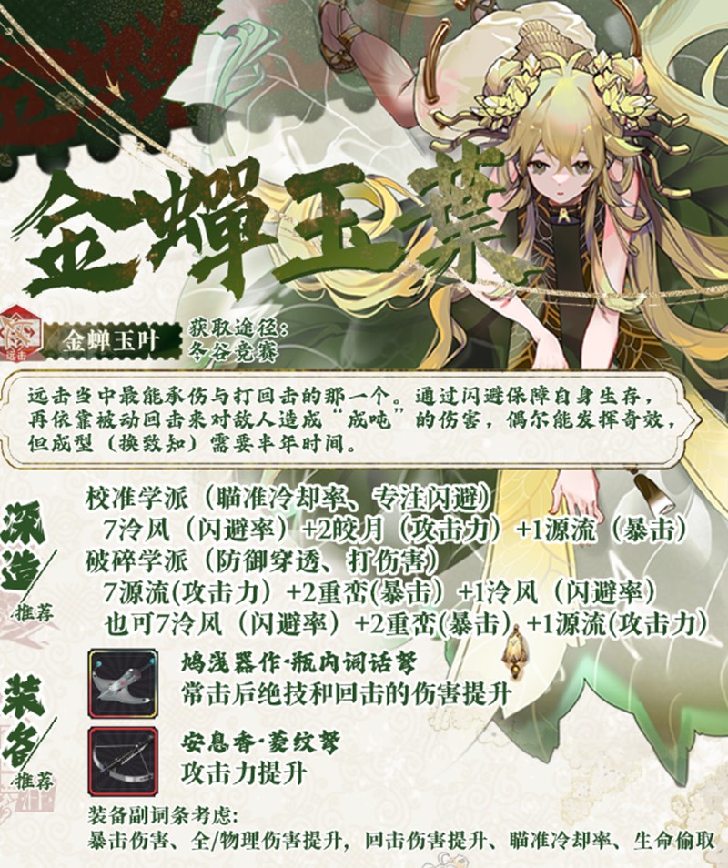 从整体强度来看,金蝉玉叶属于中远程输出型角色,虽然近战能力较弱,但凭借特殊状态和范围攻击技能,在特定阵容搭配下能发挥出不错的战斗价值。对于喜欢远程战术的玩家来说,这个角色值得关注和培养。