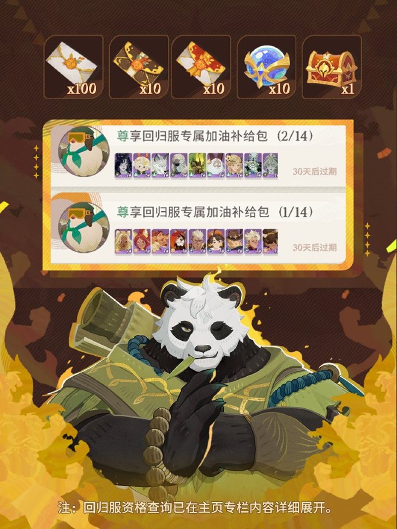 奖励:参与回归活动进入尊享回归服,可获得加油补给包(内含四族英雄本体20、全英雄招募邀请函100、UP招募邀请函10、史诗英雄招募邀请函10、星源水晶10以及至臻英雄自选箱1),通过“启程之礼”签到活动及“签到送公测首发全英雄活动”还可获取招募券、英雄、钻石等各种好礼。