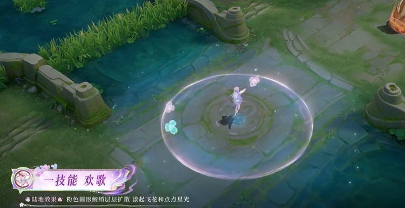 陆地效果:粉色圆形鲛绡层层扩散,漾起飞花和点点星光。