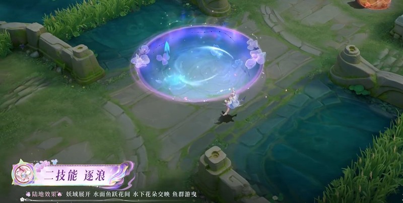 们将梦幻的粉紫色系与妖域空间的效果结合,围绕飞花、鲛绡、鱼群等元素具象化演绎鲛人不同状态下的技能特效。