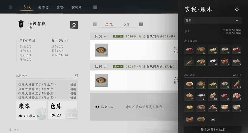 4.每人每日【可能】会有今日热卖菜肴,在【尚未展开的】烹饪队列中查看,图标上会有四字提示。各种菜肴、酒、瓷瓶消耗材料已有人整理,请自行搜索。