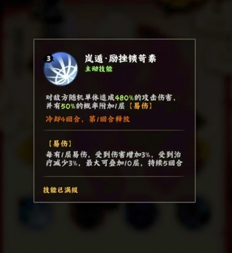 岚遁·励挫锁苛素是达鲁伊的核心主动技能,能在首回合对敌方随机单体造成480%攻击伤害的高爆发输出。这个技能有50%概率为目标附加1层易伤状态,冷却时间为4回合。在实战中,这个技能的高伤害系数可以快速压制敌方关键单位,配合易伤效果的叠加,能显著提升后续伤害输出。建议在战斗中优先锁定敌方核心目标使用,以最大化技能收益。