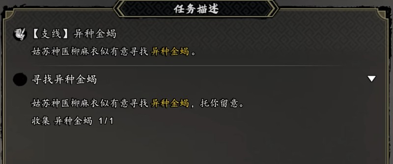想要获得异种金蝎人面蛛,首先要从清河村的支线任务开始。在清河村找到铁蛋接取毒蝎夺命任务,这是整个任务链的起点。完成这个任务后需要前往姑苏城继续推进剧情,在这里会遇到关键NPC柳麻衣,接取异种金蝎支线任务。