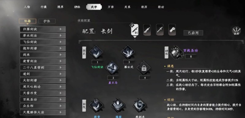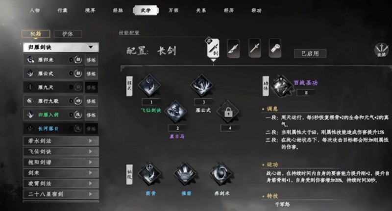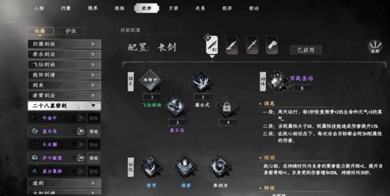 在下一站江湖2中,剑类武学包含多种剑法招式,每个招式都有对应的主动技能。玩家需要将主动技能放置在特定位置才能使用。心法属性可以通过点击查看,而被动技能则位于秘籍下方。这些被动技能会为角色提供持续增益效果,是武学升级的重要组成部分。