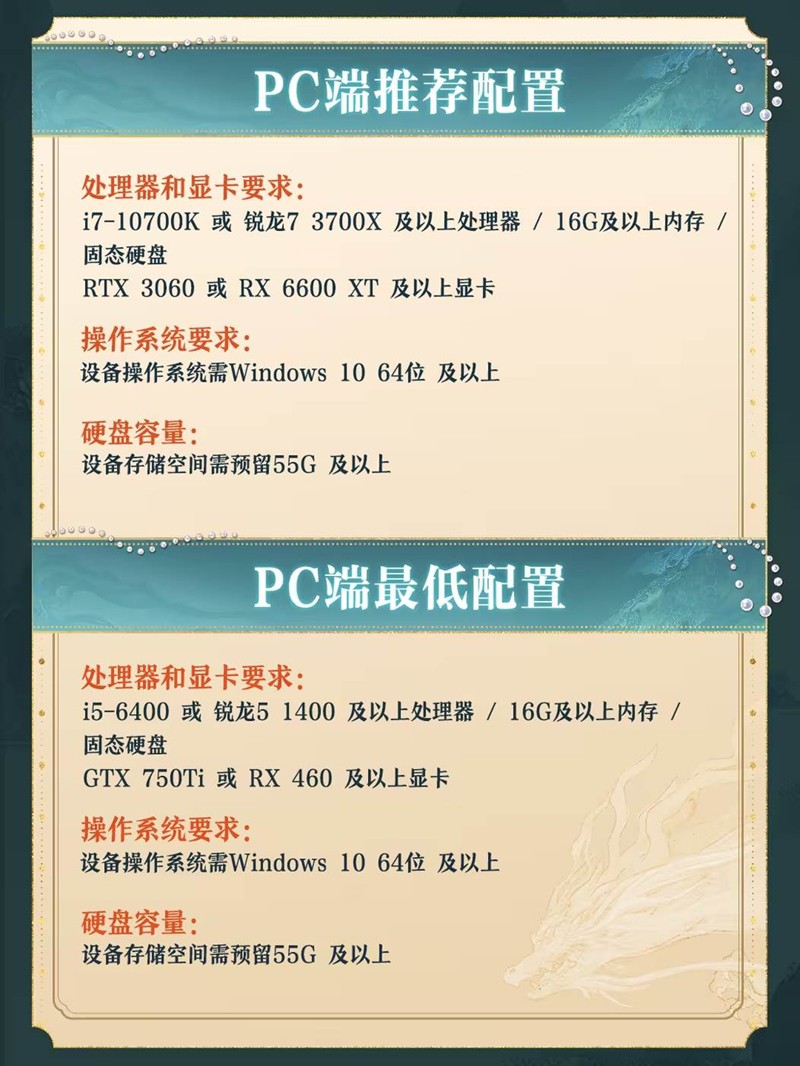 处理器和显卡要求:i7-10700K或锐龙7 3700X及以上处理器/16G及以上内存/固态硬盘,RTX 3060或RX 6600 XT及以上显卡。