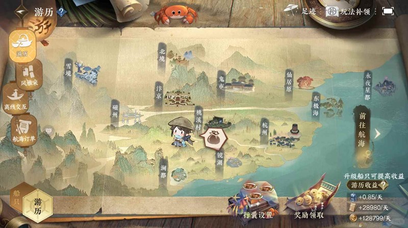 游历和航船订单,每天都看看,游历加点菜现在可以买自动探索的菜了,探索更快