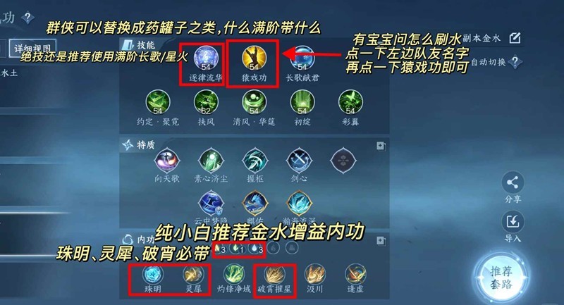 其实我更推荐金水内功,能弥补输出的不足,给队友带来增益,搭配猿戏功,后续出团本的英雄本也是完全够用的。