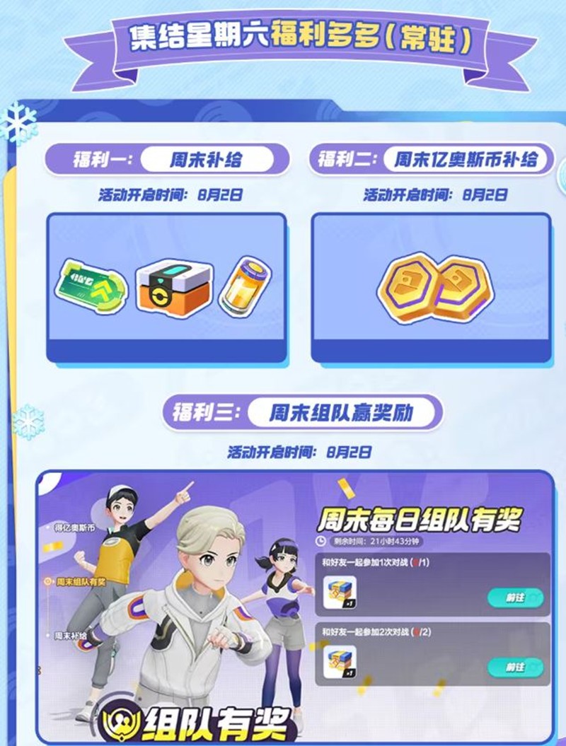 福利三:周末组队赢奖励:周末每日组队有奖,包括和好友一起参与1次对战(1次)、和好友一起参与2次对战(2次)。