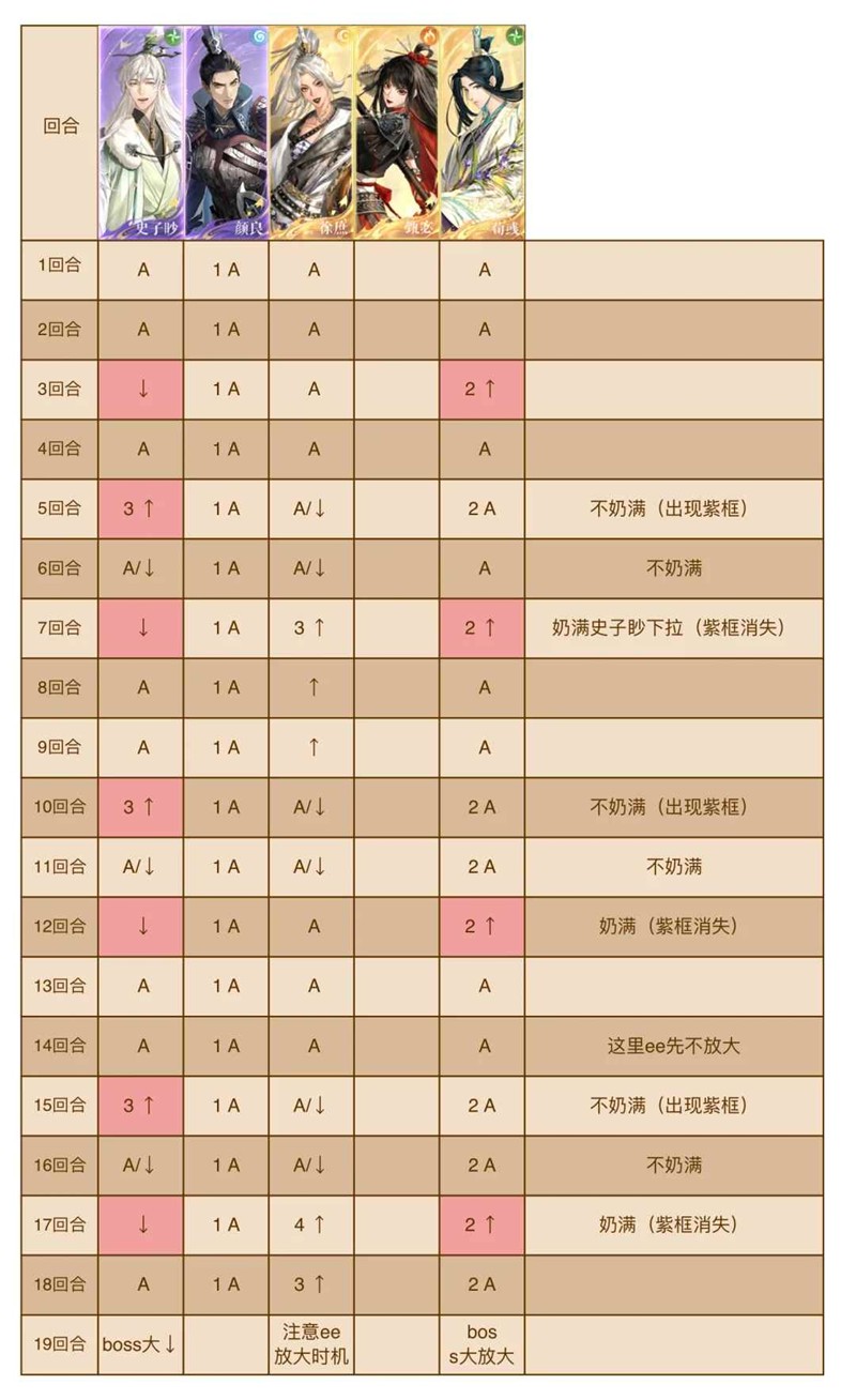 注意点:在徐庶带紫框期间,如果三回合奶不满,考虑将徐庶下拉,或者在第二回合史子眇a;如果提前奶满,考虑徐庶a,史子眇第二回合下拉;以上根据练度灵活调整,正常情况就是,徐庶带紫框第一回合和第二回合都奶不满,第三回合奶满(表格说明)