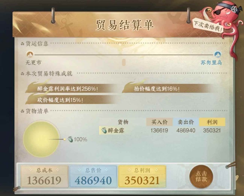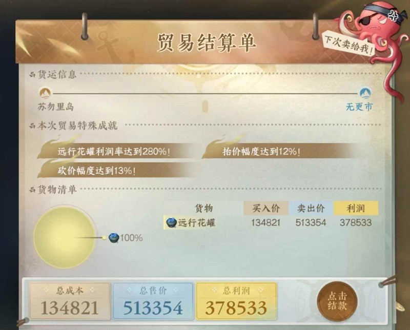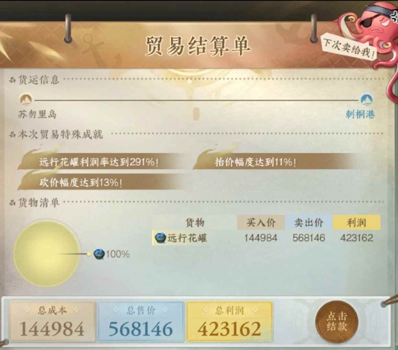 苏勿里买远行花罐卖到刺桐港/无更市,利润42w+(我这边第二趟刺桐港贸易战税率55%所以可以对比一下这两个哪个利润高就卖哪个)