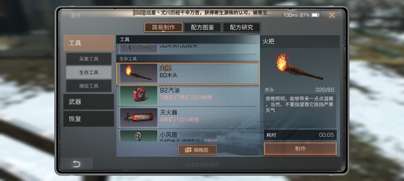 在制作等级达到4级之前,玩家可以使用60个木头制作火把作为临时照明工具。虽然火把没有篝火的取暖效果,但足以应对夜间的基本需求。如果遇到生存属性下降的情况,可以寻找地图上现成的篝火点,或者向其他玩家求助。