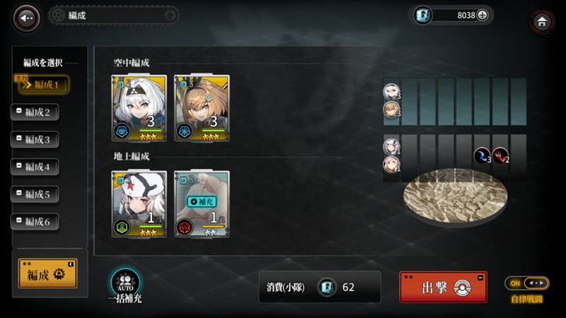 2A-2N关卡建议使用2架空战或对地型轻战斗机,最低消耗12点。如果编队达到2星且等级40以上,可以考虑全自动战斗。2A-4N关卡推荐1架战术编队中/重轰炸机、1架制空型轻战斗机和1辆轻/重坦克的组合,最低消耗17点。