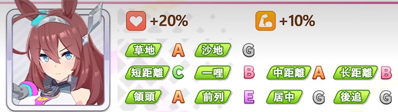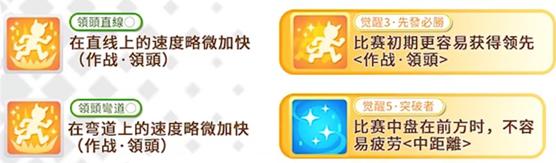 觉醒技能进一步强化了双涡轮的优势。领头直线和领头弯道分别提升直线和弯道速度,先发必胜和突破者则完善了起跑和中段的表现。这些技能与初始技能形成完美互补,使双涡轮成为各项能力均衡发展的全能型选手。