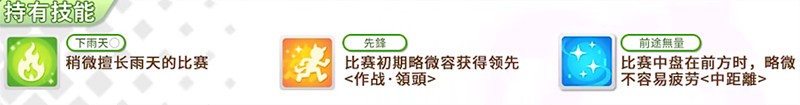 这位马娘的固有技能”最后的冲刺”非常实用,能在比赛最后阶段保持步调不紊乱的情况下大幅提升速度。初始技能配置也很全面,”下雨天”增强雨天表现,”先锋”提升起跑优势,”前途无量”则能有效延缓疲劳。这些技能组合让双涡轮在不同赛况下都能保持竞争力。
