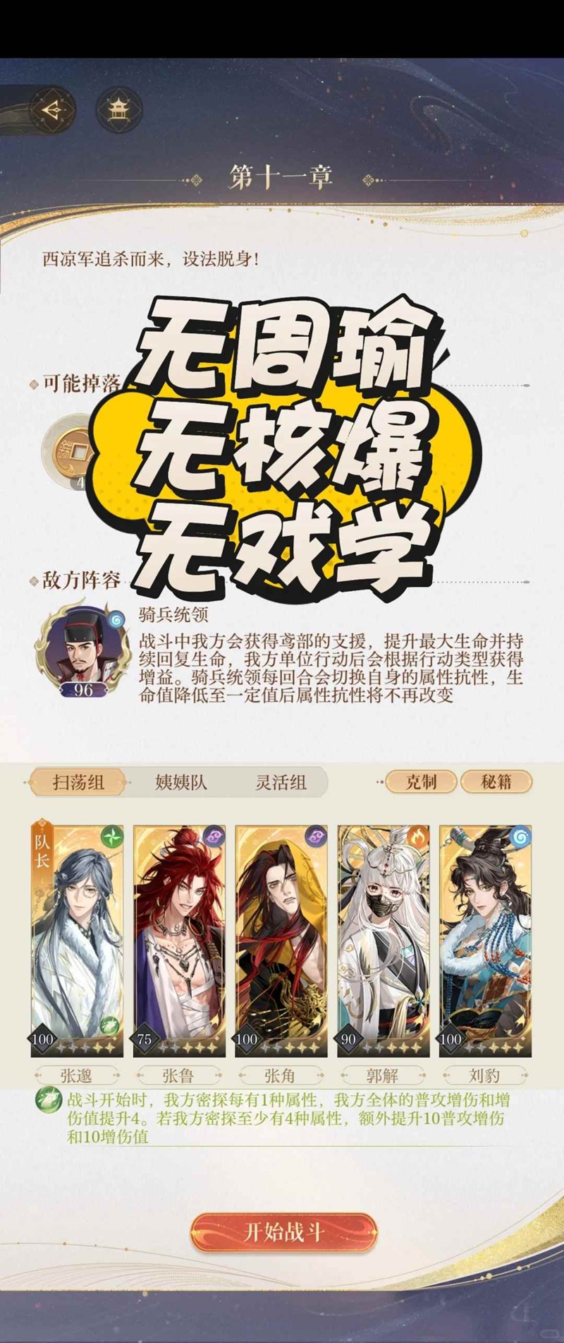 以上就是如鸢第十一章主线怎么过,11-20骑兵统领怎么打攻略的全部内容了,更多游戏资讯,攻略内容敬请关注,您的支持是我们努力的动力!