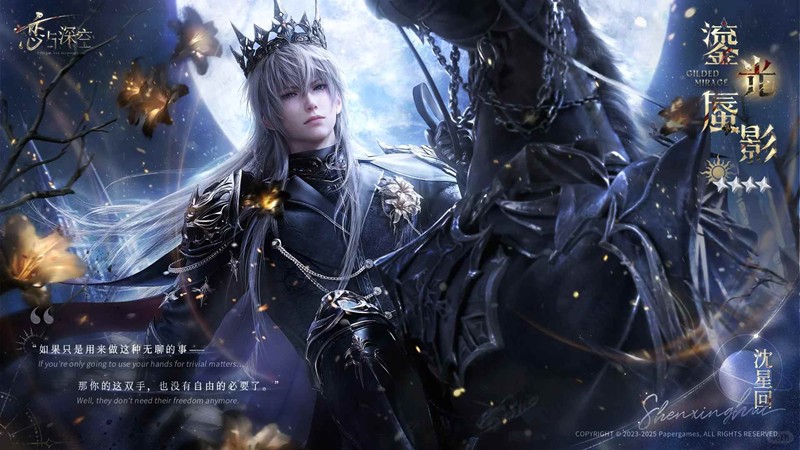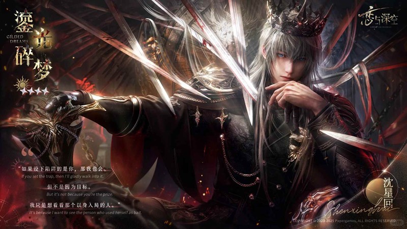 参与活动,即可免费获取四星日冕套装思念「沈星回·鎏光蜃影」、「沈星回·鎏光碎梦」、三星思念「沈星回·拭痕」、「深空许愿券·限时*10」、「钻石*500」、「拍照动作*3」、限定称号等缤纷奖励!