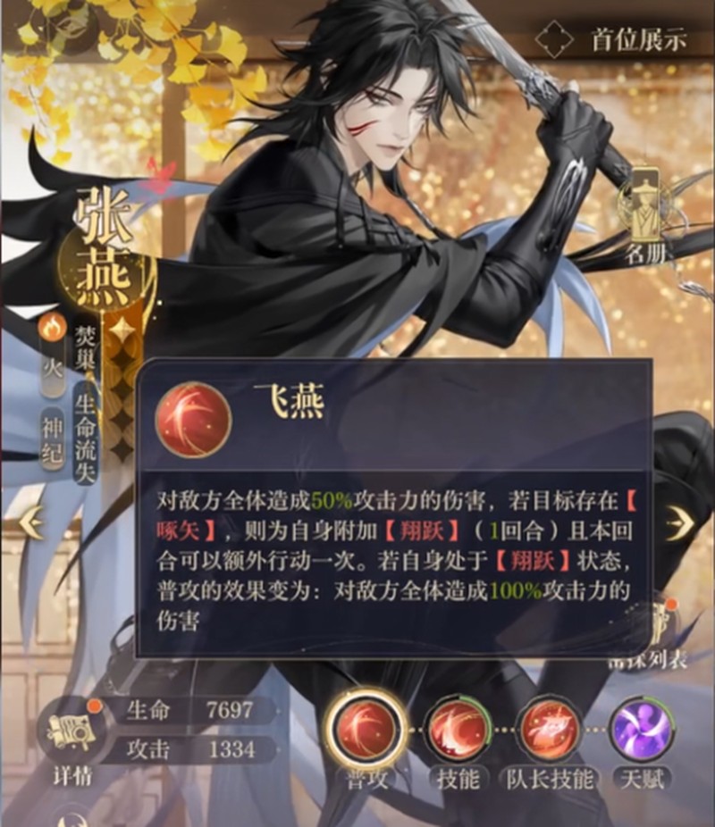 飞燕作为张燕的普攻技能,在敌人带有啄矢状态时可以触发翔跃效果。这个机制让张燕获得额外的行动机会,大幅提升每回合的输出效率。当处于翔跃状态时,他的普通攻击威力会得到显著增强。