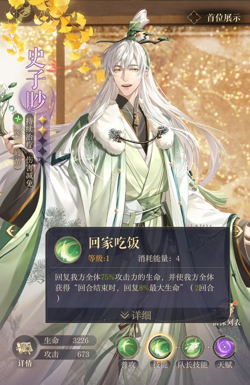 史子眇的核心能力在于群体治疗和减伤效果。虽然在没有特定命盘词条加持时减伤效果有限,但其治疗量和回复能力十分可观。这使得史子眇成为如鸢手游中不可或缺的后勤保障角色。