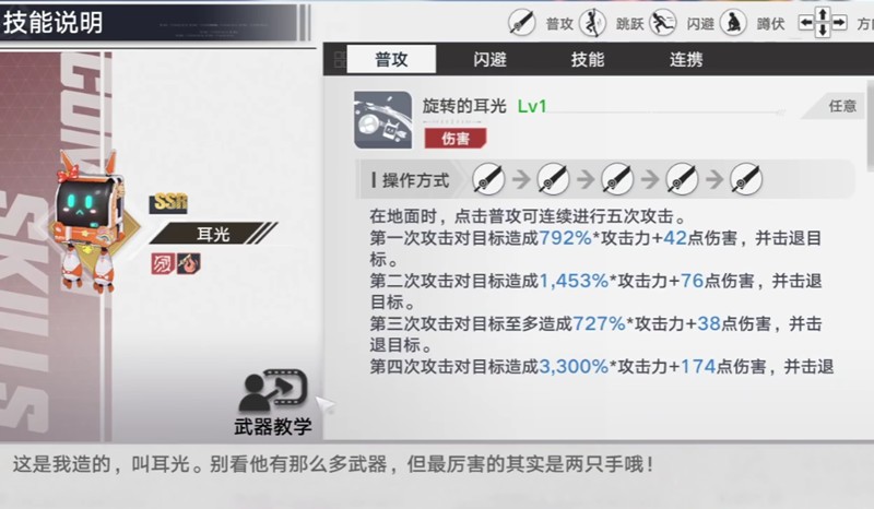 胡萝贝的战斗核心在于她的机械伙伴”耳光”,这个战斗单位可以进行多种形态切换。普通攻击分为五个阶段,初始攻击倍率为792%,最高可叠加至3300%的惊人伤害。每次攻击都附带42点额外属性伤害,并且具有击退效果,最多可连续击退目标四次。这种递增式的伤害机制让胡萝贝在持续输出时能造成可观的爆发。