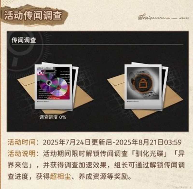活动时间:2025年7月24日更新后-2025年8月21日03:59活动说明:活动期间限时解锁传闻调查「驯化光碟」「异界来信」,并获得调查加速效果,组长可通过解锁传闻调查进度,获得超相尘、养成资源等奖励。