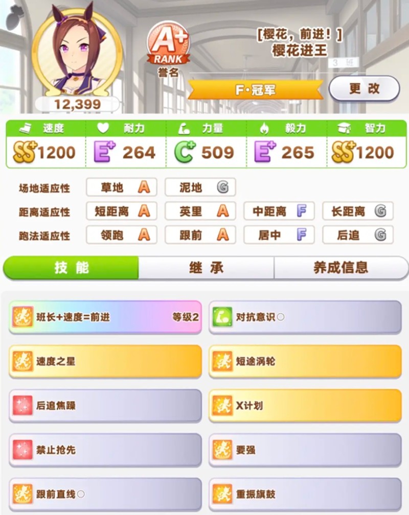 樱花进王是闪耀优俊少女初始阶段就能获得的赛马娘,在短距离比赛中表现尤为突出。这个性格急躁的赛马娘最适合草地赛道,在领跑位置时能发挥最大优势。她的专属技能”学习委员长”会在比赛后期排名靠前时触发,大幅提升速度和爆发力,是新手期非常实用的短距离选手。