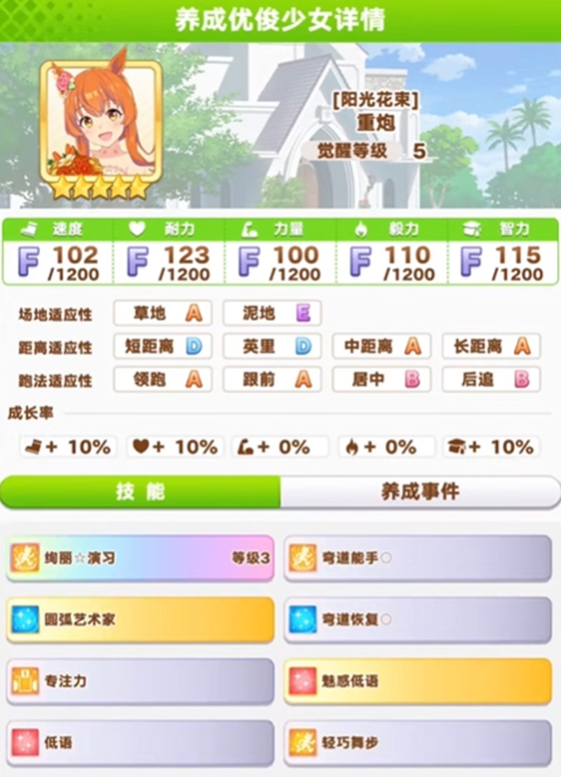 花嫁重炮是闪耀优俊少女中综合能力较强的选手,擅长中长距离草地比赛。她的特点是根据心情变化跑步速度,虽然实力强劲但成绩不太稳定。推荐在领跑或跟跑位置使用,更适合参加专属养成比赛而非主线赛事。