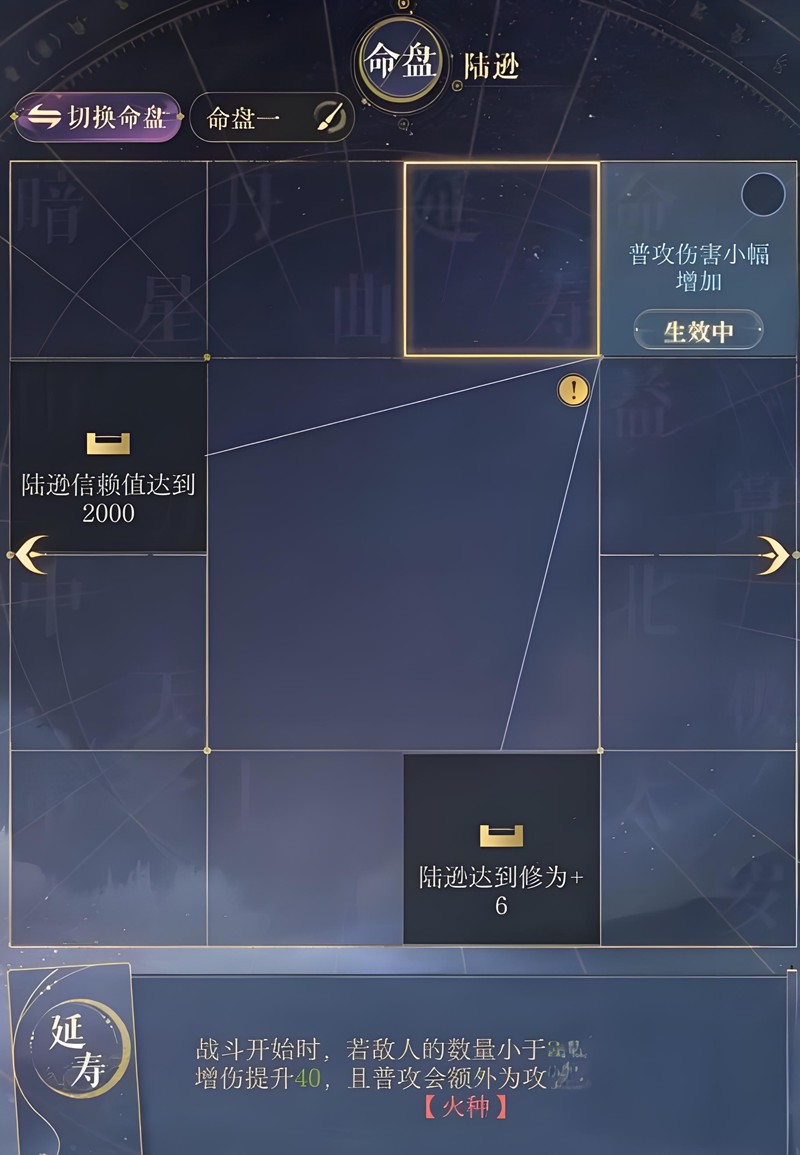 在如鸢的命盘系统中,每个角色都可以通过不同的词条组合来强化特定能力。陆逊作为火系输出核心,最适合的词条组合是灼烧效果强化。这个命盘能让他的普攻和大招都附加额外的灼烧伤害,在面对水属性敌人时效果尤为显著。当敌人被灼烧效果影响时,陆逊的持续输出能力会得到显著提升。